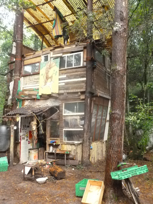 En lieu et place de "camping", il y a en fait aujourd’hui plus d’une cinquantaine de lieux d’habitation collectifs auto-construit - maison singulières ou hameaux, ainsi qu’une dizaine de fermes et bâtisses sauvées de la destruction, rénovées et occupées. Si certain-e-s d’entre nous logeons dans des caravanes, roulottes et autres résidences plus mobiles, un grand nombre d’habitats en dur édifiées sur la zone sont de véritables oeuvres artisanales et créatives utilisant une grande diversité de techniques architecturales, usant d’ingéniosité de circonstance et de matériaux à peu près gratuits : terre paille, terre crue, poutres et palettes, pneus, verre, pierre... Certaines maisons reposent à terre, sur pilotis, d’autres sont venus se nicher dans les arbres ou flotter sur l’eau. Nos logis sont sûrement plus joyeux et chaleureux que bien des résidences en série, eco-hlm et autres immeubles gris. Autour de ces habitats, la zad compte une vingtaine de nouveaux projets agricoles et maraîchers, mais aussi des espace collectifs pour faire de la radio, la fête, des cantines, fabriquer du pain, transformer du lait, coudre, lire, jouer, se soigner, réparer des vélos ou des voitures. Des habitant-e-s ou agriculteurs-trices "historiques", ayant fait le choix de résister aux expropriations et menaces d’expulsion vivent toujours là au coté du mouvement d’occupation. Nous sommes tous et toutes aujourd’hui des "habitants qui résistent".
