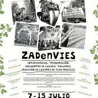 Este programa esta pendiente de algunos cambios y complementos de aquí a agosto. No se olviden de inscribirse antes escribiendo a : alaczad@riseup.net # toda la semana : expo foto "territorios en batalla" Lunes 27 de agosto : # 10h : acogida / presentación de la semana # 14h : Este lunes y luego cada día después de la comida a la hora del café, anuncios varios y presentaciones libres de participantes al encuentro. # 17h : Xarla alrededor del libro "Pelear para espacios, pelear para (...)