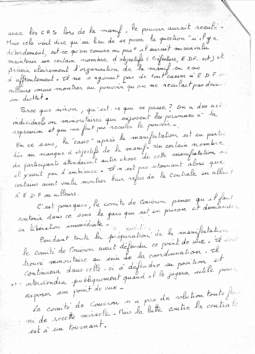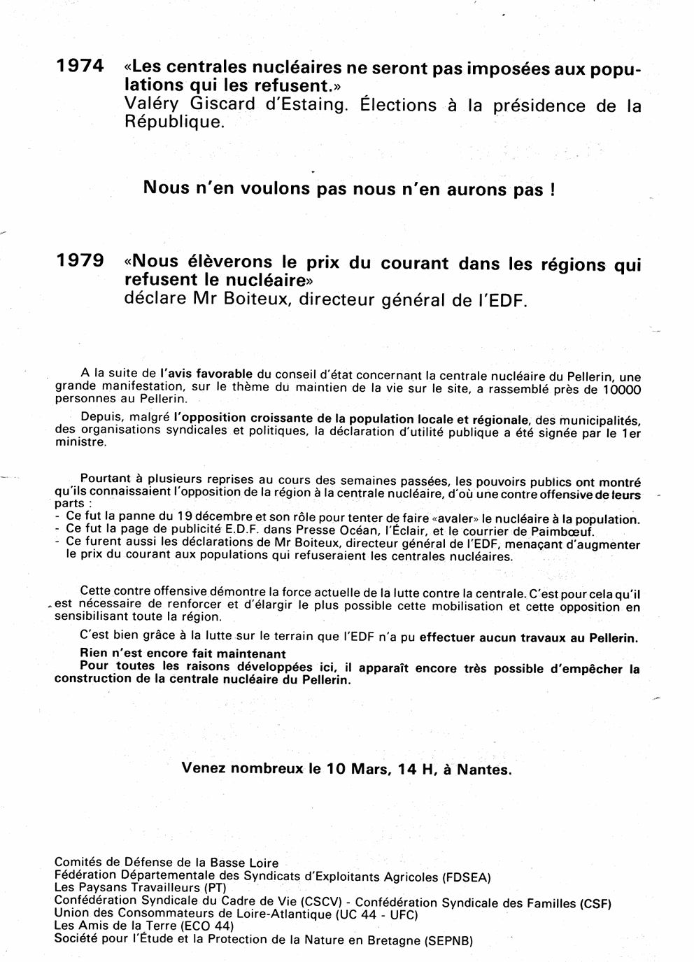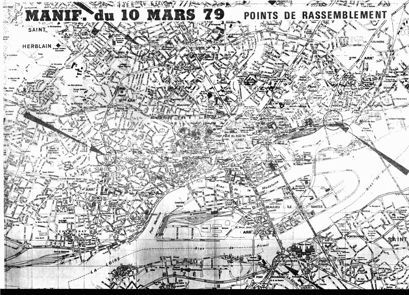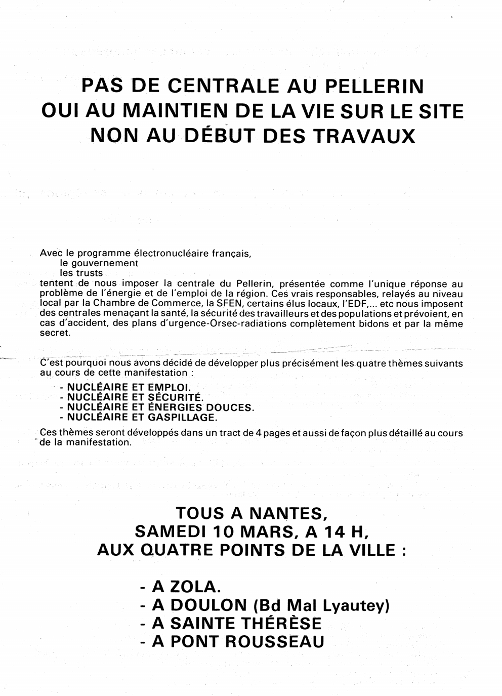 En mars 1979 la coordination (contre la centrale nucléaire de Pellerin) organisa une grande manifestation avec 4 cortèges qui descendent sur le centre de Nantes. En annexe le tracte qui appelle aussi que les points de rassemblement. En plus on voit que l’occupation du terrain était aussi à l’époque une tactique utilisé.