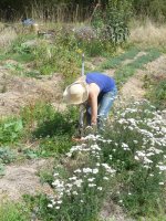 Désherbage et paillage dans le jardin, effeuillage et tri de plantes au séchoir, plantations...