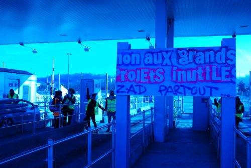 dans la Drôme : une opération « péage gratuit » à la sortie Valence Sud de l’Autoroute A7, en opposition au projet d’aéroport de Notre Dame des Landes