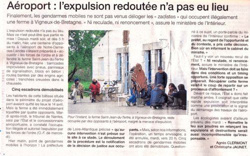 Sur Ouest France/Maville ils disent... : Ce mercredi matin, les militants anti-aéroport attendent toujours l’intervention des forces de l’ordre. En vain. L’opération, qui, selon nos informations, était effectivement calée dès mardi matin, a été annulée vers 20 heures au plus haut niveau de l’État. Cinq escadrons de gendarmes mobiles ont alors été démobilisés.