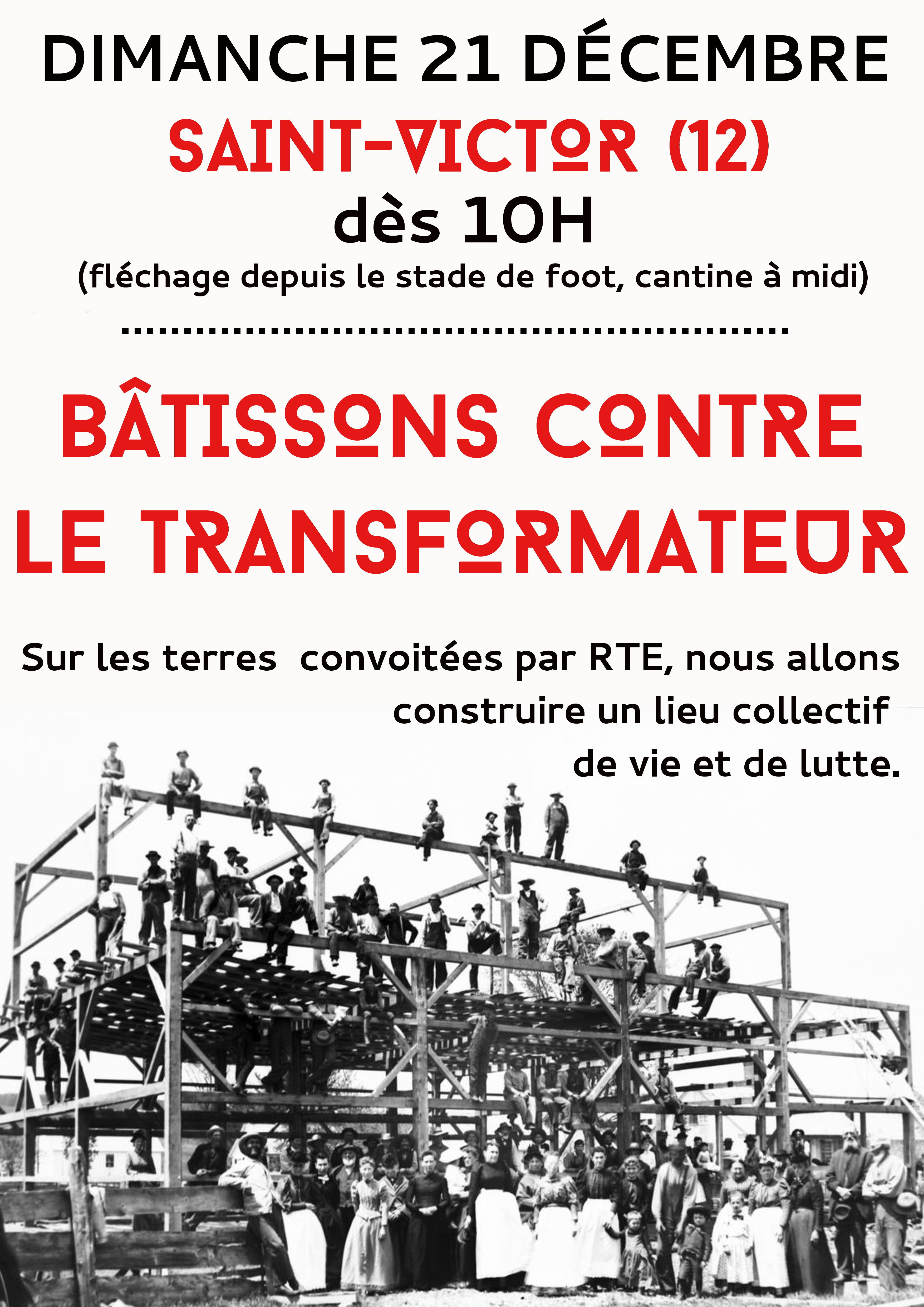 Les luttes de Notre-Dame-des-Landes ou de Sivens nous ont appris qu’il était parfois possible de stopper la mise en œuvre de grands projets nuisibles, dès lors qu’un combat déterminé, juste et populaire est mené. A Saint-Victor, nous n’allons pas attendre que les travaux et les expropriations commencent pour rendre concret notre refus. Nous avons donc décidé de construire dès aujourd’hui un lieu dévolu à la lutte. Un lieu où se réunir, où s’organiser, où accueillir des sympathisants. Un lieu d’où puisse grandir le mouvement. Un lieu autour duquel planter des arbres, cultiver des jardins qui matérialise très concrètement le désir de continuer à habiter sur ce territoire, à vivre sur cette terre et donc de les défendre. Ce lieu nous allons le bâtir tous ensemble sur les terres convoitées par RTE, il sera riche de la vie que nous défendons, et fort de notre conviction : le transfo ne se fera pas !