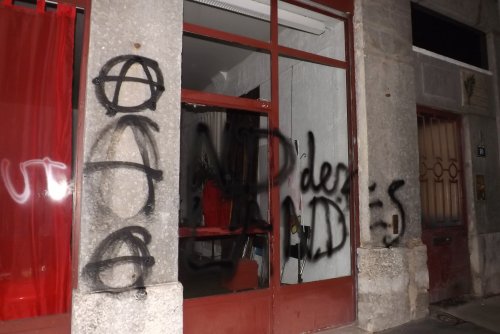 dans la manifestation d’aujourdhui une action de solidarite avec la ZAD en s’attaquant au local du PS et la permanence de la depute des hautes alpes, voici les photos tenez bon !!nous sommes avec vous !