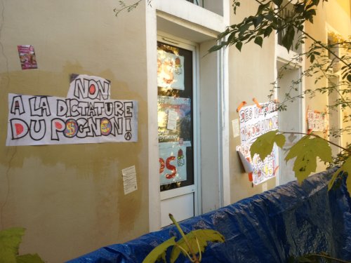 Avant de quitter les lieux, nous avons nettoyer le hall. (Morale de l’histoire, scandée au mégaphone : Il est plus facile de foutre le bordel que de le ramasser). Après une photo de « famille » devant les bureaux et un câlin collectif, nous étions sur le départ quand dans une ruelle annexe, nous nous sommes fait arrêter par la police, qui nous avait laissé partir quelques minutes auparavant. Nous avons donc eu le droit à un contrôle d’identité, sans aucun motif évoqué, et à une fouille au corps. Pendant cette interpellation, nous avons tout de même eu le soutien des rares passants.