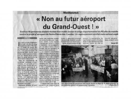 Une quarantaine de personnes ont manifesté devant le siège départemental du PS pour protester contre le projet d’aéroport. Etaient présents des membres d’associations, de partis politiques ou de simples citoyens. Le rassemblement s ’est poursuivi par une déambulation bonne enfant.