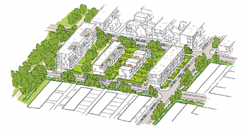 Construire en lien avec l’existant et s’ouvrir sur le quartier : les formes urbaines seront variées, elles dialogueront avec l’environnement urbain sur les contours du site. Le projet prévoit une imbrication fine du bâti et de la nature dans le cœur boisé du futur quartier.