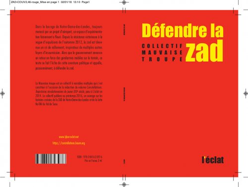 A l’automne 2015, le gouvernement a annoncé que démarrerait au plus vite les travaux de l’aéroport de Notre Dame des Landes. Il a martelé sa volonté d’expulser la zad, intolérable « zone de non droit », de l’ensemble de ceux qui l’habitent et la cultive. Avec les efforts conjugués des tractopelles de Vinci et des grenades de la gendarmerie, il entend tenter, une fois encore, « dès que possible », de venir à bout de tout ce qui pousse et vit dans ce bocage. Face à la menace d’une nouvelle invasion armée, nous prenons aujourd’hui la parole pour appeler, partout, à défendre la zad, et à travers elle tout l’espoir contagieux qu’elle contient dans une époque plombée. La conviction qu’il est possible d’arrêter les projets destructeurs de ceux qui prétendent nous gouverner et de se libérer du joug de l’économie. L’aspiration à inventer ici et maintenant d’autres manières d’habiter le monde, pleines et partageuses. Cet espoir s’ancre dans une histoire commune, riche des élans de dizaines de milliers d’insoumis et de liens indéfectibles soudés par le temps. Cette brève nouvelle politique invoque quelques fragments décisifs de cette aventure, comme autant de conjurations face à la menace et de repères éclatants pour l’avenir. Nous sommes quelques habitant.e.s de la zad de Notre dame des landes ou proches compagnons de route qui vivons depuis des années au diapason de cette rébellion. Au sein de la Mauvaise troupe, nous travaillons depuis quelques mois à en récolter et à en colporter les récits dans un ouvrage encore en construction. Mus par un sentiment d’urgence, nous avons décidé de prendre la plume pour rédiger préalablement les lignes qui suivent. Dans un époque où règne le « je », nous avons l’ambition de parler ici au « nous ». Celui employé dans ce livret nous dépasse et se risque même à incarner au fil du récit une des paroles collectives d’un mouvement fort de son hétérogénéité. Il n’en est ni la vérité ni la voix unique, mais une hypothèse sur ce qui se construit de commun et d’indéracinable, dans l’entremêlement vivant de nos positions et de nos expériences singulières.