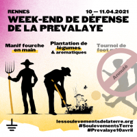 #SoulevementsTerre La manifestation a été déclarée et autorisée par la Préfecture - Rendez-vous à 10h fourches en main du mail F.Mitterrand jusqu’à la Prévalaye ! Attestation à avoir pour se rendre à la manifestation ci-joint. (voir en bas) Début mars, un large ensemble de fermes, territoires en lutte, réseaux et collectifs lançaient « les soulèvements de la Terre » (voir appel et signataires ici : https://lessoulevementsdelaterre.org/ ). Un printemps d’action d’occupation de terres et blocages (...)