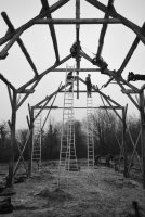 Cela faisait un mois qu’une équipe déterminée de charpentier.es taillait les fermes sur du bois sorti de la forêt de Rohanne et préparait leur ascension depuis le hangar de l’avenir. Dans le même temps des soutiens de collectifs et associations divers ainsi que des camarades solidaires sont venus renforcer ses fondations (voir liste complète ici : https://zad.nadir.org/spip.php?article6805. Après le lever de charpente à la gaieté l’an dernier et des mobilisations sur la question de l’habitat et du PLUI, le principe de reconstruction sur les fermes historiques a été établi, nous en avons poursuivi la concrétisation aujourd’hui. L’ « école des tritons » est un des rejetons des ébullitions de cette année et une étape de plus dans les engagements de reconstruction que le mouvement s’est donné pour l’avenir de la zad. Elle est pensée comme un lieu de formation qui vise à nourrir les relations interespèces sur zone et à alimenter des mobilisations et actions contre l’intoxication du monde. Pour plus de détail ou pour contribuer à la construction par le biais de la campagne de financement participatif voir : https://www.helloasso.com/associations/association-la-solid-r/collectes/des-fonds-pour-la-construction-d-une-ecole-des-tritons )