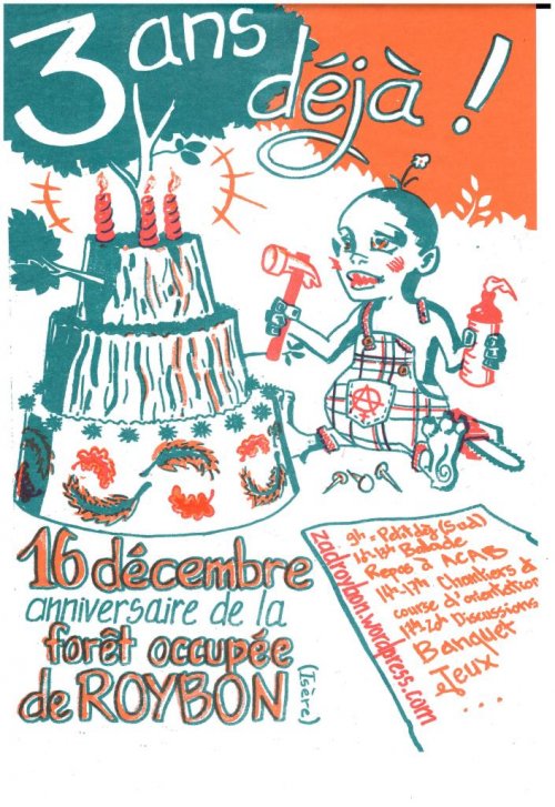 Nous sommes heureuses-x de vous annoncer… que l’occupation de la forêt roybonnaise fête ses trois ans bientôt ! Venez fêter ça le 16 décembre, toute la journée !