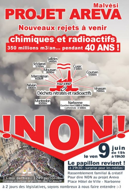 Après une "enquête publique" pendant l’automne 2016, Areva a lancé un projet de traitement des effluents nitratés radioactifs pour son usine de Malvési située à moins de 3 km du centre ville de Narbonne. Le "collectif de vigilance des déchets de Malvési" (Covidem) s’est créé en février 2017, et une pétition contre ce projet a été lancée, elle a déjà rassemblé plus de 5000 signataires : https://www.petitions24.net/non_a_la_surpollution_atmospherique_dareva_malvesi